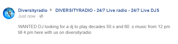 WANTED DJ looking for a dj to play decades 50.s and 60 .s music from 12 pm till 4 pm here with us on diversityradio friendly radio station been going a very long time on the internet play any thing please check it otu ur self we on fb or twitter other places to or drop in to http://www.diversityradio.co.uk/chat/